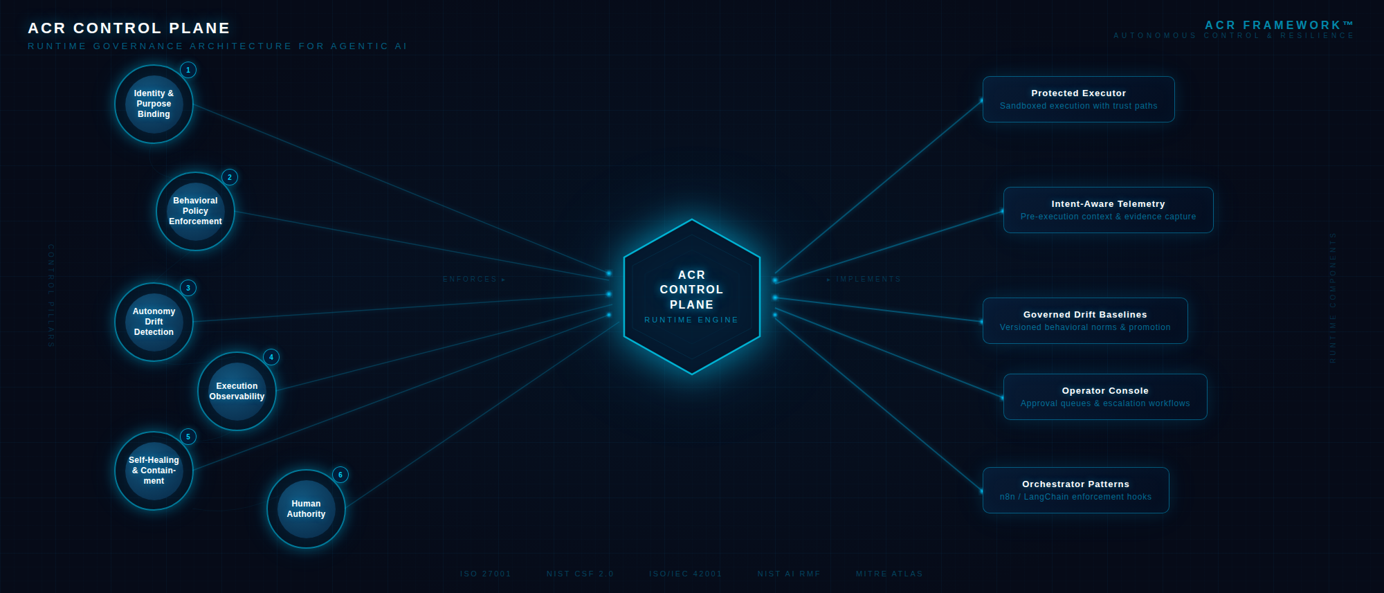 The ACR Standard defines six operational control pillars. The Control Plane implements all six as a composable decision pipeline: